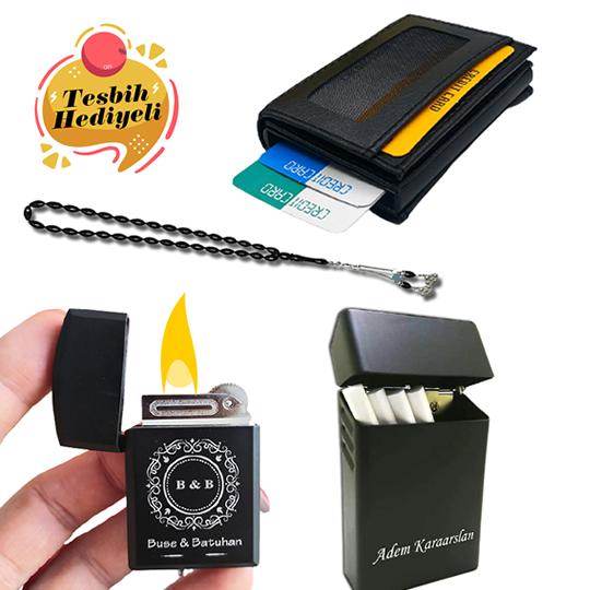 Hediye Setimizin içinde 1 adet çakmak, 1 adet metal sigaralık, 1 adet mekanizmalı cüzdan, 1 adethediye olarak eklenen tesbih bulunmaktadır. Cüzdan özellikleri: Standart boy 6,5 cm 9,5 cm. 1 adet para bölmesi 1 adet ayrı kart bölmesi 1 adet kimlik bölmesi ve 4-5 kartlık mekanizma bölmesi mevcuttur. Ürün 1. sınıf suni deri ve işçilik ile üretilmiştir. Çakmak; ithal metal malzemeden üretilmiş, alt kısımda gaz ayar yeri ve gaz doldurma haznesi bulunmaktadır. Çakmağımız içi gaz dolu olarak sizlere ulaşmaktadır. Ürünümüz hediye paketinde sizlere ulaşmaktadır.